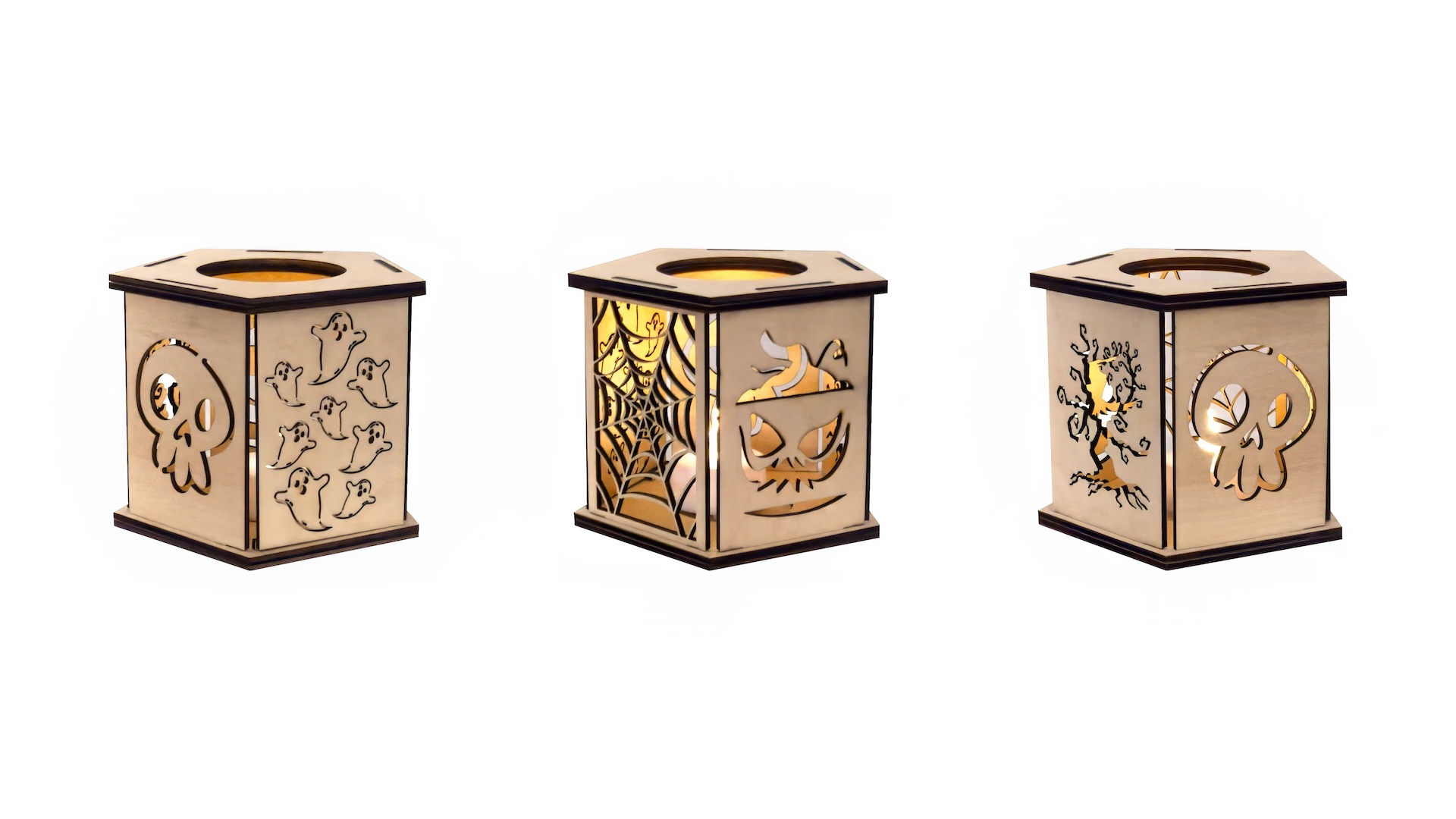 Wood tealight Halloween lanterns. Includes electric tealight for safe operations. Lanterns have doors or openings for easy access to candle compartment. Lanterns includes a NFC chip that is pre-loaded with Spooky Halloween short stories when scanned with smartphones. NFC can also be later customized with a personal message (configuration instructions included with product).